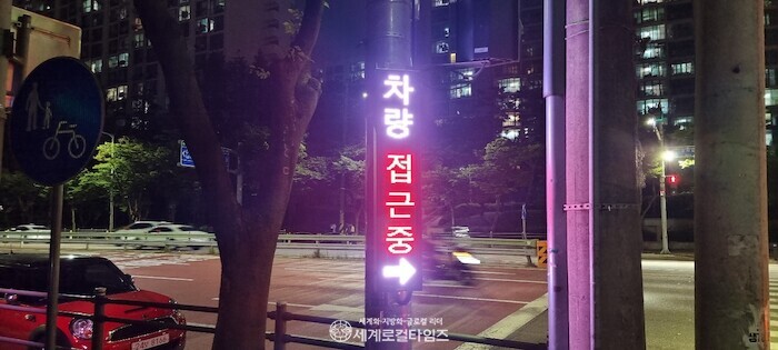 시스템은 내장된 영상감지기로 차량과 보행자의 이동 경로를 확인한 뒤 전광판과 음성 안내로 접근 여부를 알려주는 방식으로 작동한다.