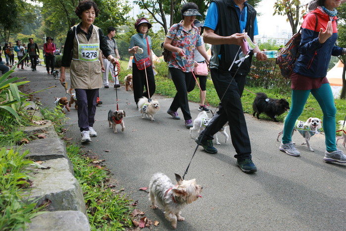 | ▲ 지난해 열린 반려동물 사랑축제 '또 하나의 가족' 행사에 시민들이 애완견을 데리고 숲길을 걷고 있는 모습. <사진제공=강동구청> |