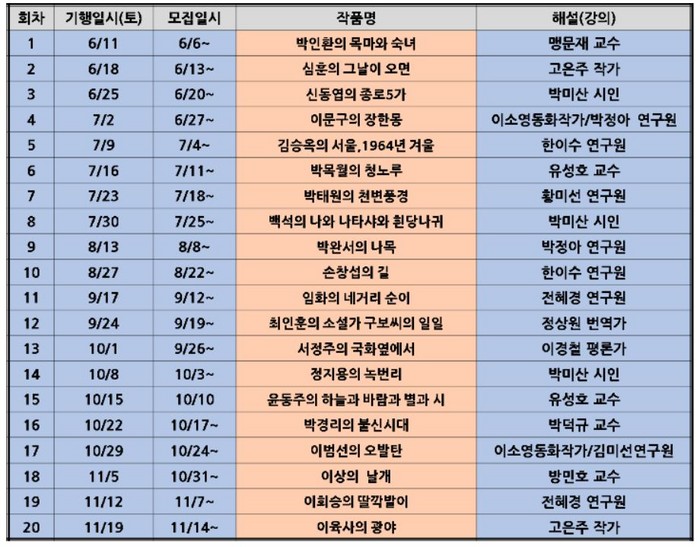 11일~11월 19일까지 매주 토요일 총 20회…회차별 다른 문학작품 진행