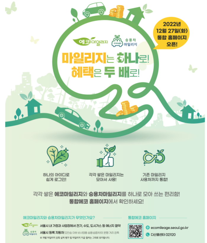 [세계로컬타임즈 이효진 기자] 서울시는 그동안 각각 운영해온 에코마일리지와 승용차마일리지 누리집(홈페이지)을 통합해 운영한다.