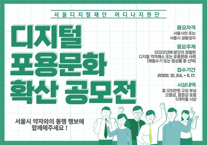 [세계로컬타임즈 이효진 기자] 서울디지털재단은 서울시 디지털 약자와의 동행 사례 발굴을 위해 ‘2022 디지털 포용문화 확산 공모전’을 개최한다.