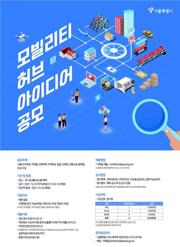 [세계로컬타임즈 이효진 기자] 서울시는 시민 편의 향상과 미래 대중교통 혁신을 위한 다양한 발전 안을 모집하기 위해 ‘모빌리티 허브 아이디어 공모전’을 개최한다.