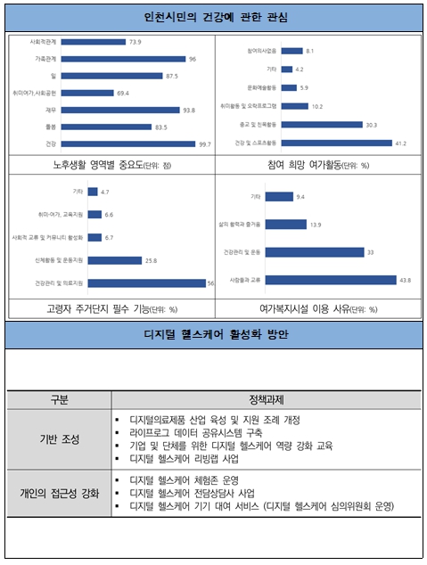 인천연구원 양지훈 연구위원은 “디지털 헬스케어에 대한 이용자의 욕구와 기업의 속도를 법과 제도가 따라가지 못하고 있는 상황으로, 인공지능과 사물인터넷 시대에 맞춘 기업에 대한 지원과 시민에게는 일상생활에서의 접근성 향상 지원을 통해 인천시민이 건강 노화를 달성할 수 있는 환경을 마련해야 한다.”라고 밝혔다.