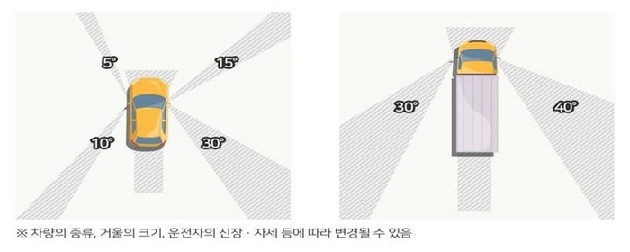 일반승용차의 경우 후측면 사각지대가 운전자 쪽은 10°, 조수석 측은 30°이나 2.5톤 화물차의 경우에는 각각 30°, 40°에 이르고 일반승용차에는 없는 전방 사각지대가 1미터 발생한다.