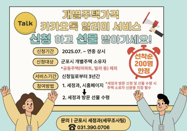 • 온라인 신청: 군포시 홈페이지 분야별 정보 ' 세금 ' 세금이란? ' 개별주택가격 ' 카카오톡 알리미 서비스