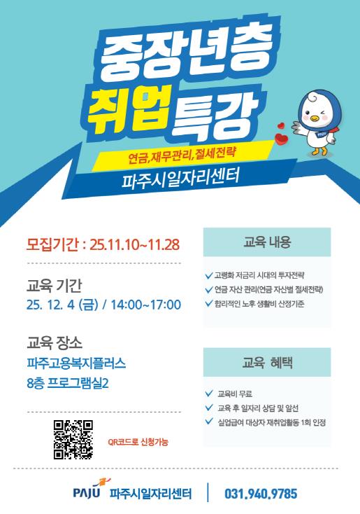 신청은 파주시 일자리센터, 문산·운정행복센터 일자리상담 창구 방문 또는 구글서식(온라인 신청)을 통해 가능하며, 교육대상은 파주시 거주 만 40세~59세 중장년층 구직자이다. 교육은 파주시 일자리센터에서 진행된다.