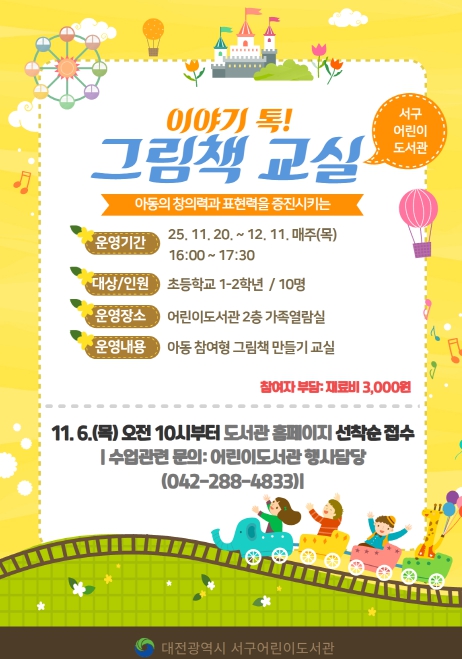 이달 20일부터 12월 11일까지 총 4회차에 걸쳐 운영되는 이번 프로그램은 아동이 상상력과 창의력을 발휘해 자신만의 이야기를 글과 그림으로 표현하는 창작형 독서 활동이다.
