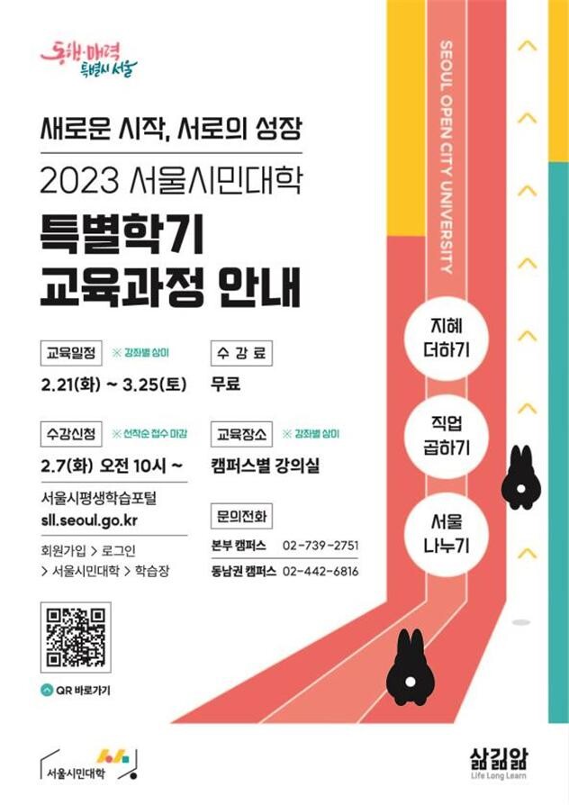[세계로컬타임즈 이효진 기자] 서울시민에게 폭넓고 깊이 있는 학습 기회를 제공하는 서울시민대학이 ‘2023년 특별학기’ 수강생을 모집한다.