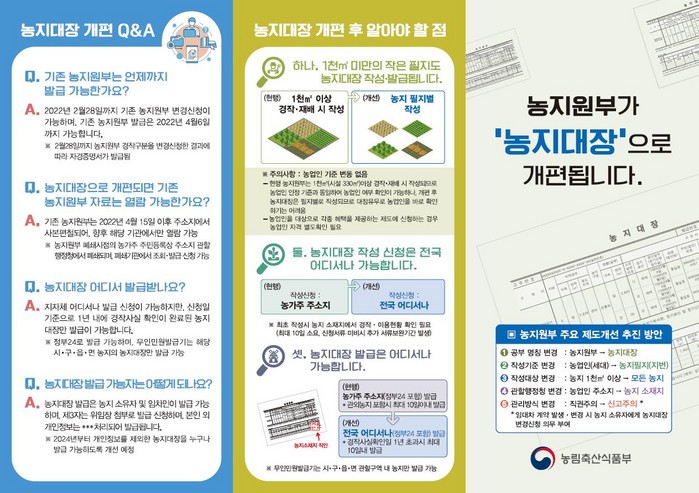 개편에 따른 주요 내용으로는 현행 세대 기준으로 작성하던 농지원부와 달리 토지대장 등 타 공부와 같이 필지별로 작성되며, 작성 대상도 현행 1000㎡이상 농지 면적 제한이 폐지되고 모든 농지로 확대된다.
