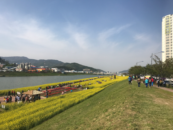 유채꽃 향연이 펼쳐지는 양산천 유채경관단지는 신기동 우방아이유쉘아파트 인근에 위치하고 있다.