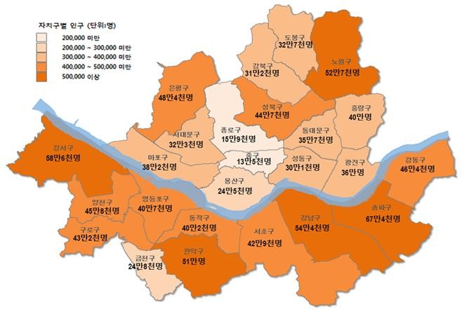 자치구별 총인구는 송파구(673,926명)가 가장 많고, 중구(134,635명)가 가장 적게 나타났다.