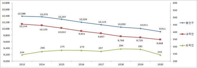 [세계로컬타임즈 이효진 기자] 서울시 인구가 2020년말 기준 991만 명으로 32년 만에 1,000만 명 미만으로 나타났다.
