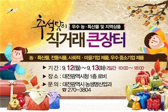▲ 대전시청서 오는 12일과 13일 개최하는 추석맞이 우수 농특산물 직거래재 큰장터 행사 포스터.<사진제공=대전시청> |