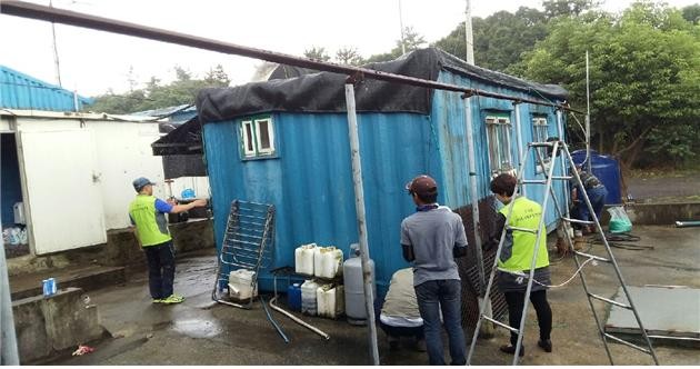 | ▲ 제주시 폭염대비 안전대책반 관계자들이 지난해 컨테이너에서 거주 하는 주민을 위해 차광막을 설치하고 있는 모습.<사진제공=제주시청> |