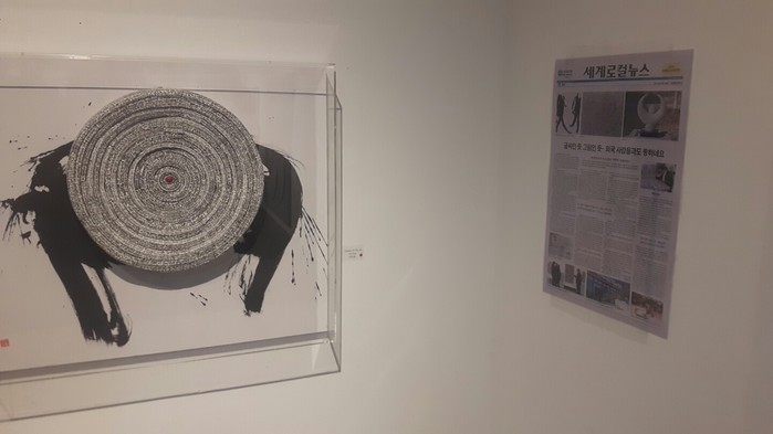 | ▲ 허회태 작가 개인전에 설치된 작품들과 세계로컬신문 인터뷰 지면. |
