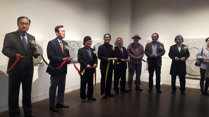 | ▲ 허회태 작가(왼쪽 네번째)와 초청 인사들이 26일 개인전 개막식에서 축하 리본을 자르기 위해 준비하고 있다. |