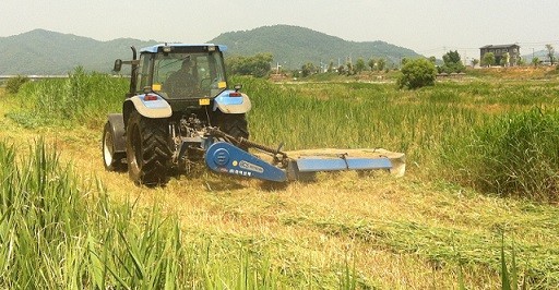 이번 야초 수확에는 살미한우작목반과 중앙탑한우영농법인이 나서 각각 달천강변(10ha)과 남한강변(30ha)에서 작업을 진행하고 있다.