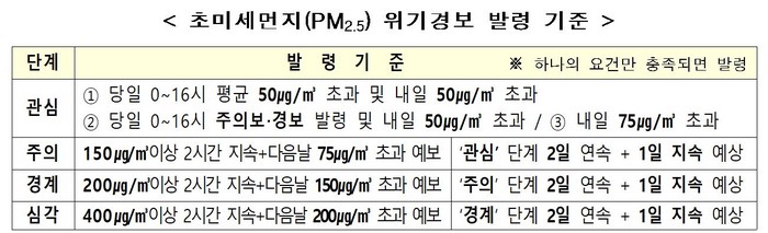 [세계로컬타임즈 이효진 기자] 환경부는 수도권 지역(서울·인천·경기)에 초미세먼지(PM2.5) 위기경보 ‘관심’ 단계를 발령하고, 각 지자체별로 ‘비상저감조치’를 시행한다 지난 10일 발표했다.