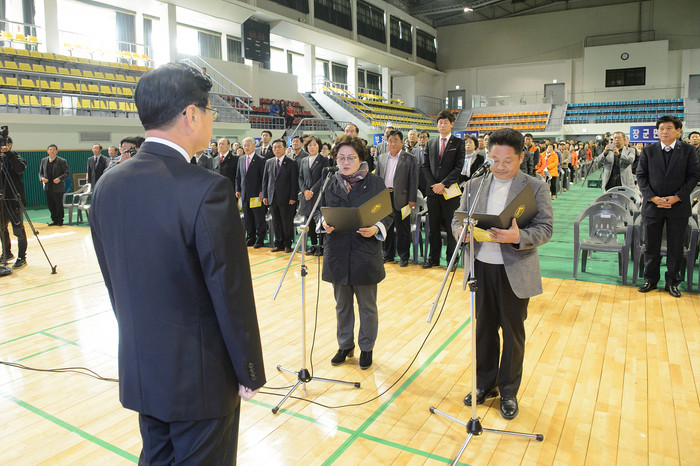 | ▲ 8일 세종시민체육관에서 농업인과 소비자 1500여명이 참석한 가운데 제5회 세종시 농업인 한마음대회를 열고 있다.<사진제공=세종시청> |