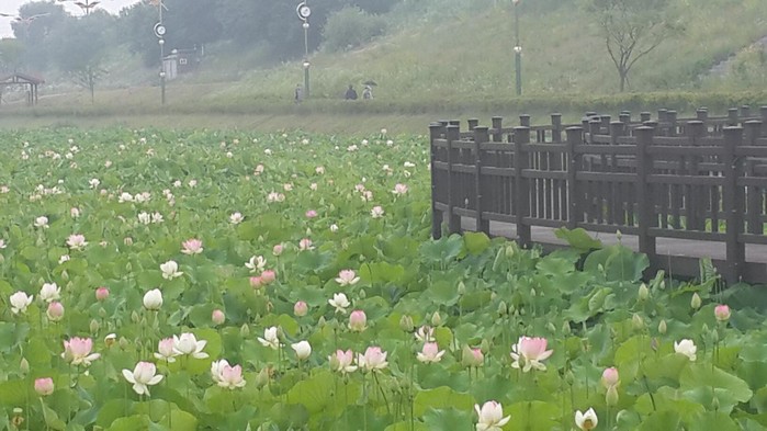 | ▲ 세종시 조치원읍 조천 연꽃공원에 연꽃이 활짝핀 가운데 시민들이 산책로를 거닐고 있다.<사진제공=세종시청> |