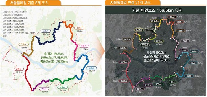 8개 코스를 21개 코스로 변경하게 되면 전체 코스의 평균 길이는 8km 정도로, 당초 8시간 정도 잡아야 했던 완주시간을 평균 3시간으로 단축해 앞으로 더 많은 시민이 부담 없이 도전할 수 있게 될 것으로 기대된다.