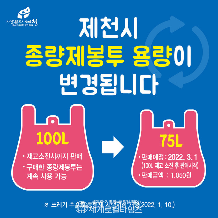 [세계로컬타임즈 김병호 기자] 제천시가 종량제봉투 최대용량을 100리터에서 75리터로 하향 조정한다.
