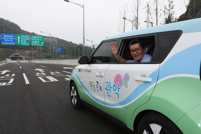 | ▲ 유종필 관악구청장이 친환경 자동차를 타고 감남순환도시고속도로를 달리며 손을 흔들고 있다.<사진제공=관악구청> |