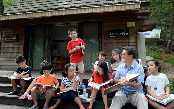 | ▲ 유종필 관악구청장이 숲속작은도서관에서 어린이들과 책을 읽으며 이야기를 나누고 있다.<사진제공=관악구청> |