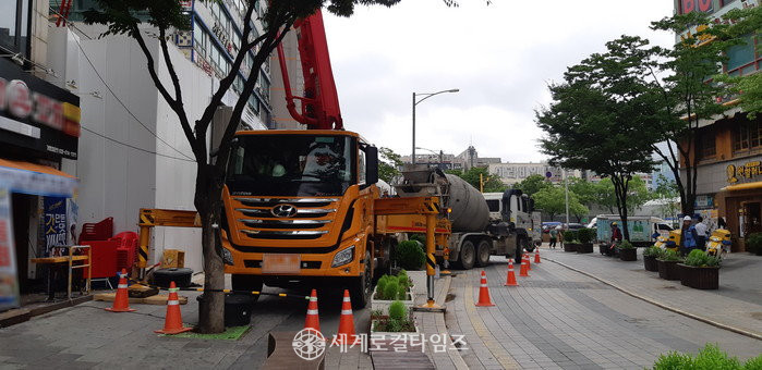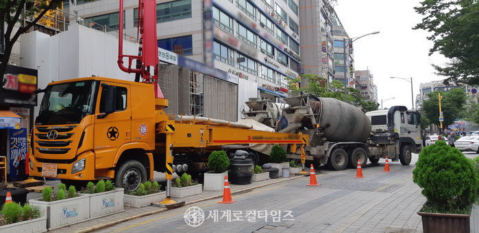 B업체가 시공 중인 A관광호텔 신축공사장은 인도 등 보행로를 확보하지 않아 통행에 불편을 주고 있으며, 대형 펌프카와 레미콘 차량의 소음으로 인해 주민들의 반발이 거세다. 차량 진행을 위해 직원이 수신호를 하고 있지만 교행이 쉽지 않아 운전자들이 항의하고 있는 상태다.
