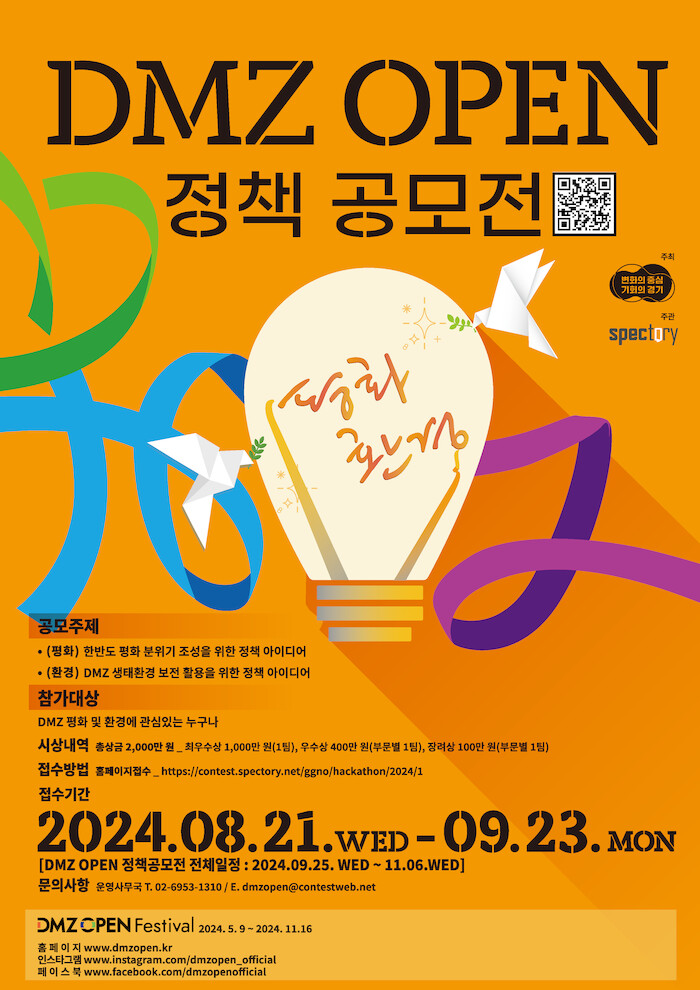 경기도 김태현 평화협력과장은 “이번 공모전은 디엠지(DMZ)의 생태환경 가치를 널리 알리고 한반도 평화 분위기를 높이는 계기가 될 것이며, 참신하고 실질적인 정책 아이디어를 채택하여 도정에 반영할 수 있도록 노력하겠다”고 말했다.