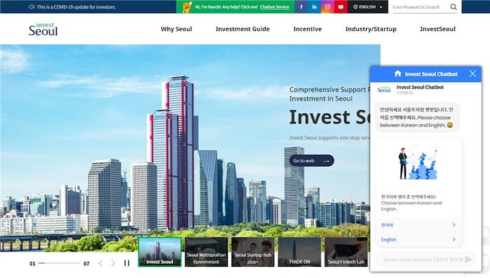 [세계로컬타임즈 이효진 기자] 서울투자청은 전세계에 있는 외국인 투자자들을 대상으로 24시간 시공간 제약 없이 국·영문 상담을 제공하는 AI(Artificial Intelligence, 인공지능) 기반 챗봇 서비스를 오늘(19일)부터 제공한다.