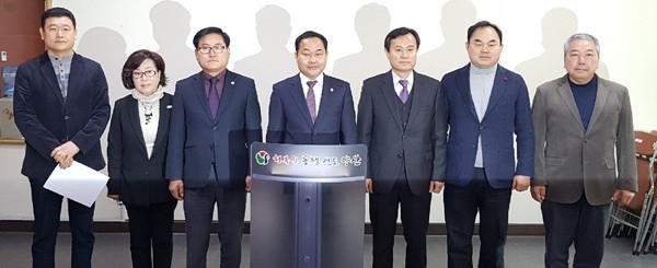 | ▲ 양산시의회 자유한국당 소속 의원들이 지난 12일 기자회견을 갖고 일자리 사업과 관련한 모든 위탁사업비가 불법으로 사용에 대해 수사를 촉구하고 있다. |