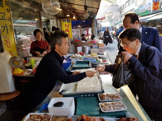 | ▲ 조종래 부산중소기업청장(오른쪽)이 지난 3일 대연동 못골 골목시장을 방문해 물건을 구입한 후 돈을 지불하고 있다.<사진제공=부산중기청> |