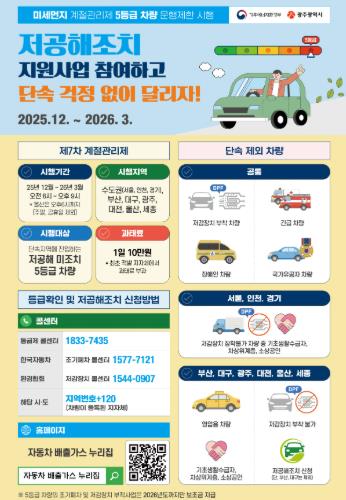 [세계로컬타임즈] 광주광역시는 12월1일부터 내년 3월31일까지 4개월간 ‘제7차 미세먼지 계절관리기간’으로 운영, 저공해 조치를 하지 않은 배출가스 5등급 차량의 운행을 제한한다.