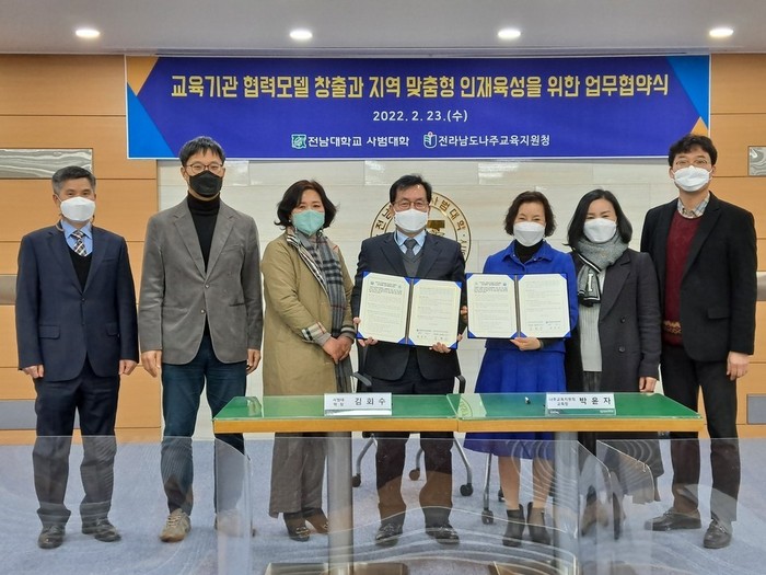 [세계로컬타임즈 강석운 기자] 전라남도나주교육지원청은 전남대학교 사범대학과 23일 전남대학교에서 대학의 우수한 자원 연계 교육기관 협력모델을 창출하고, 지역 맞춤형 우수 인재 육성과 전남미래교육기반을 구축하기 위한 업무협약(MOU)을 체결했다.