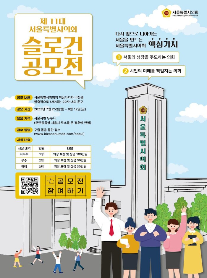 서울시의회는 새롭게 출범하는 제11대 의회의 정체성과 지향하는 바를 표현하는 슬로건을 제작해 의정활동 방향으로 삼기 위해 이번 공모를 실시한다.