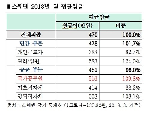 납세자연맹에 따르면 스웨덴 민간부문 근로자의 평균임금은 478만 원(101.7%), 공공부문은 451만 원(96%) 등 스웨덴 근로자 전체의 월 평균임금은 470만 원으로, 공공부문 평균임금이 민간부문 월평균임금보다 5.7% 가량 낮은 것으로 조사됐다.