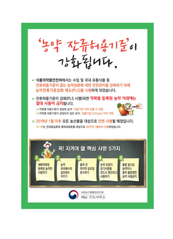지난 21일 국립농산물품질관리원 해남진도사무소는 내년부터 농약잔류기준 강화제도(PLS)가 전면 시행됨에 따라 농가들의 농약사용에 주의가 요구된다고 밝혔다.