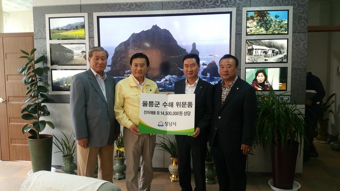 | ▲ 12일 성남시 관계자들이 집중호우로 피해를 입은 울릉군 관계자에게 1450만원 상당의 물품은 전달하며 기념촬영하고 있다.<사진제공=성남시청> |