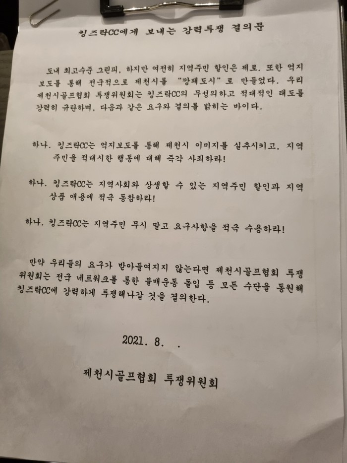 | ▲제천시 골프협회가 킹즈락 골프장에 보낸 공개 서면.(사진=킹즈락 제공) |