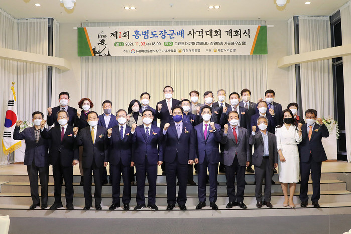 | ▲ 제1회 홍범도장군배 사격대회 개회식에서 관계자들이 기념촬영을 진행하고 있다.(사진=창원시) |