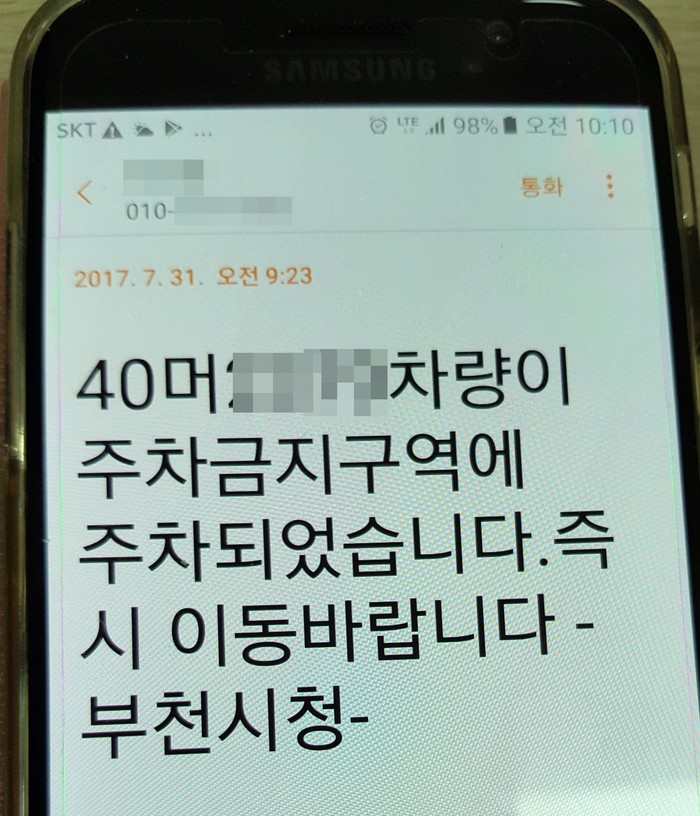 | ▲ 부천시가 차주에게 보낸 주정차단속 대상 문자알림글.<사진제공=부천시청> |
