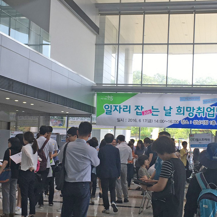 | ▲ 성남시지난 6월 성남시청 로비에서 열린 일자리 잡는 날 희망 취업박람회 행사장에 시민들이 면접을 보기 위해 분비는 모습.<사진제공=성남시청> |