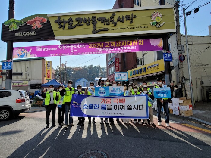 ▲8일 화순군상하수도사업소가 고인돌전통시장에서 물 절약 캠페인을 펼치는 모습.(사진=화순군)