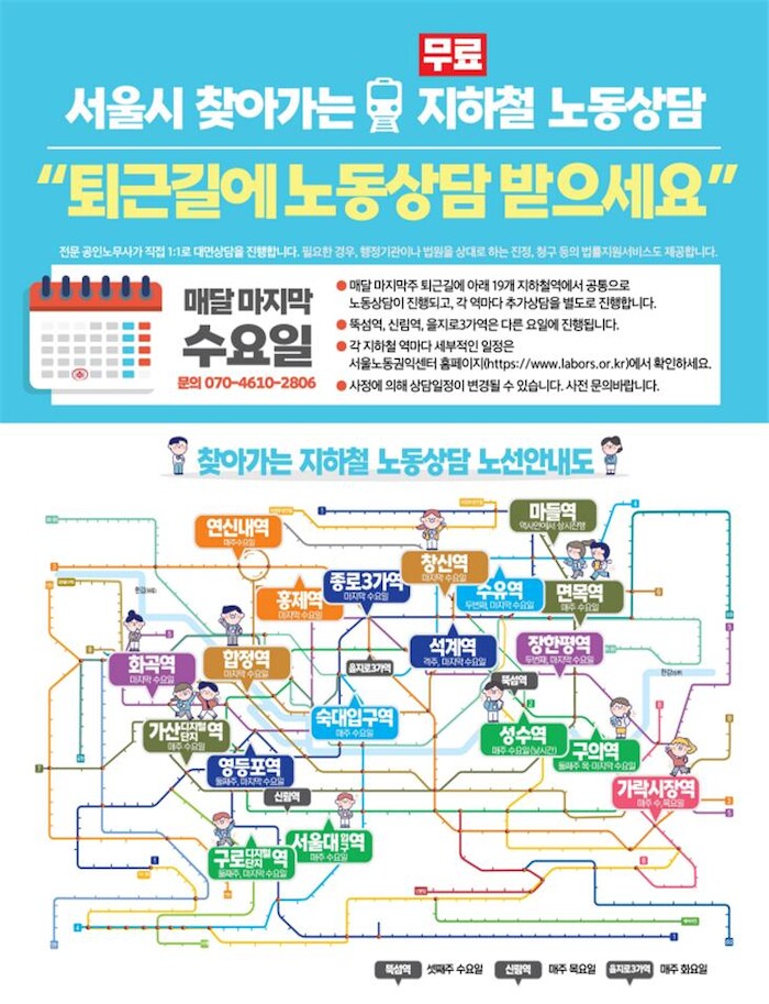 [세계로컬타임즈 이효진 기자] 서울시가 매주 마지막주 수요일 직장인들의 퇴근 시간에 맞춰 서울 시내 22개 주요 지하철 역사에서 ‘찾아가는 무료노동상담’을 진행한다.
