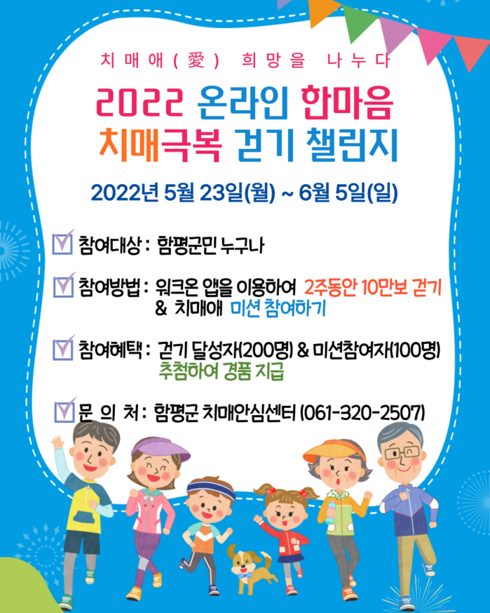 [세계로컬타임즈 이남규 기자] 함평군 보건소가 ‘2022년 온라인 한마음 치매 극복 걷기 챌린지’를 진행한다.