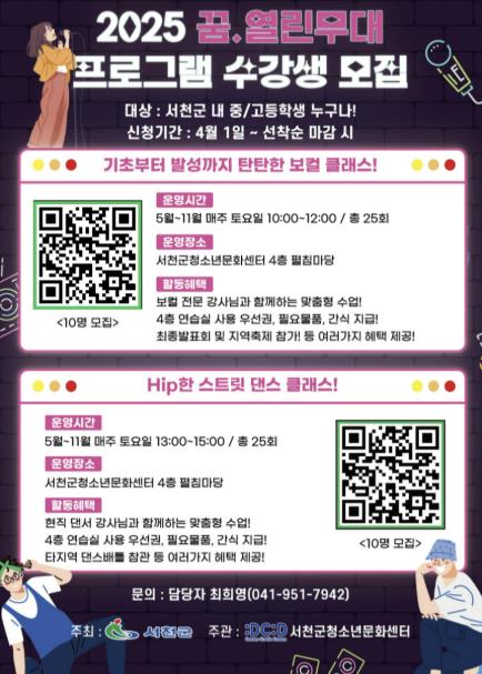 ‘꿈·열린무대’는 보컬과 스트릿댄스 등 청소년들이 선호하는 문화예술 분야의 전문 교육 프로그램으로 구성되며, 현재 서천군 내 중·고등학생을 대상으로 참여자를 모집 중이다.