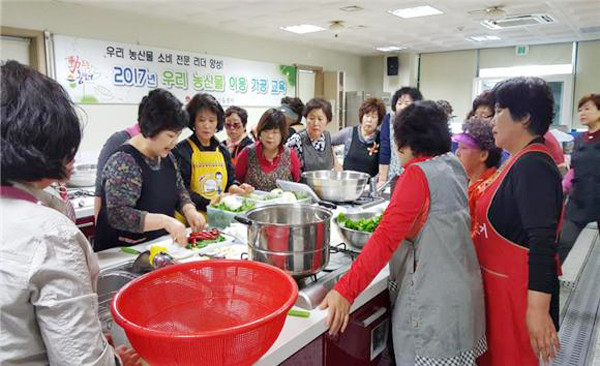 | ▲ 동해시농업기술센터가 지난 25일 생활개선회원들이 참여한 가운데 곰취를 이용한 장아찌 담그기 실습교육을 진행하고 있다.<사진제공=동해시청> |