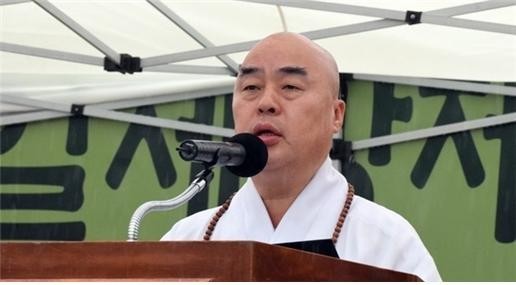 | ▲ 지난해 광복절 일제 강제징용희생자 유해봉환식 및 추모제'에서 유해봉안위원회 김무원 상임위원장 스님이 성명서를 발표하고 있는 모습. |
