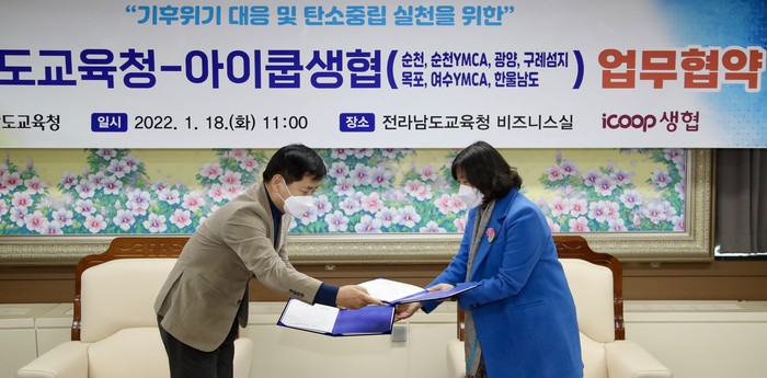 [세계로컬타임즈 김명진 기자] 전라남도교육청(교육감 장석웅)과 전남지역 7개 아이쿱(iCOOP) 생활협동조합이 18일 전라남도교육청 비즈니스실에서 기후위기 대응 및 탄소중립 실천을 위한 업무협약을 체결했다.